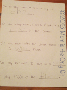 I made up this simple Fill in the Blanks sheet to give Cutie Pie a quick activity that he could do all on his own (he was 7 at the time) while I finished up a project I was working on. This was so simple! You can come up with a few sentences really quickly and have an activity that will keep your kids occupied!
