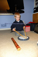 Sweet Pea woke up early from his nap that day and had a field trip to the music store with Hubby. I was told he had a blast! Evidently Sweet Pea was very gentle with all the instruments he was allowed to play, which included some guitars, keyboards, various hand drums and a drum set! Of course, percussion instruments include things other than just drums…chimes, bells, xylophone, gong, blocks, triangle…and lots more, too!