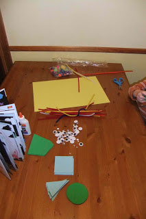 To make our “Shape Guys” as Sweet Pea calls them now when he sees them in the book, I gathered the supplies I thought the boys would have fun using: google eyes, pipe cleaners, foam paper, foam shapes, scissors and glue.