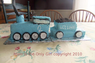 We crushed chocolate sandwich cookies for coal on the tender, just laying it on so the frosting didn’t show, then used white frosting and frosted the center of 12 more cookies and gently stuck them to the side of the cake for wheels. We also used 4 more cookies, stacked with frosting in between, as a smokestack, and frosted that stack to match the engine. I suppose had we thought about it and had more time we could have used black licorice to make the wheels connect.