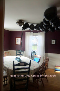 After blowing up 20 black balloons, and not fainting, I taped them to the ceiling to make the rest of the smoke from the smokestack!