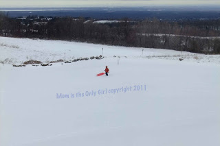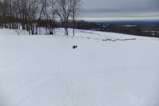 We spent a few days at Christmas in the home where I grew up sledding in our back field on inner tubes as a kid. The packed inner tube run with wooden ramp wasn’t there, and we had to make our own sledding trail, so we chose a slightly shorter hill to take Cutie Pie sledding on instead. My Dad’s home is on the side of a hill and about 10 miles away is a lake, which you can clearly see in this pic of Cutie Pie at the bottom of the sledding hill if you know what you are looking for! (It’s the silver sliver at the top left!)