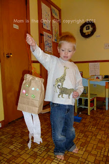 We took simple lunch size paper bags, decorated them with stickers and crayons, attached crepe paper to the bottoms (fine motor) and yarn through holes at the top (after folding it over once or twice to reduce the chances of tearing) and they were off! They ran and ran around our loop with their little kites trailing behind them! (gross motor, coordination) Winter kites, indoor winter fun!