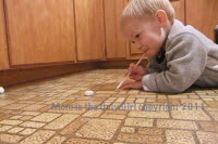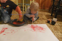 One night a week or two ago I had one boy who wanted to paint and another who just wanted to get into the pantry. I got a straw out for Sweet Pea, the 2 yr old who was attempting to get his own sweets from the pantry, and let him play with it while I got some paint ready for Cutie Pie. I laid out some big white paper on the kitchenette floor and prayed the boys would be relatively quite and occupied while the lessons were going on in the adjacent room.